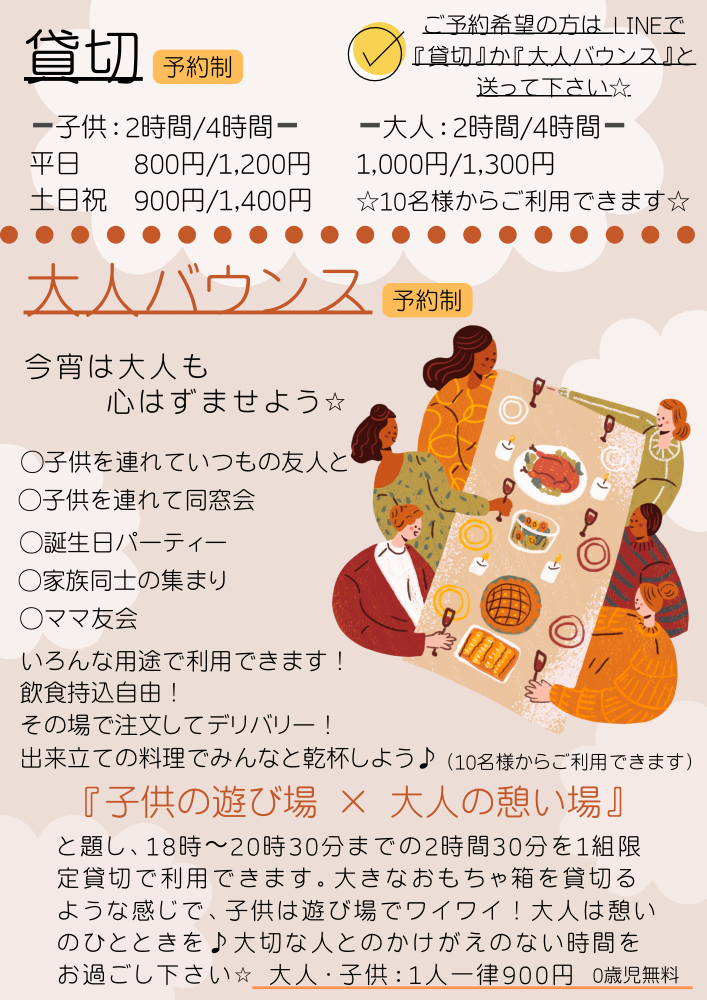 | その他 | 事前予約は不要ですが、予約優先になります。 人数制限によりご利用をお断りさせて頂く場合がございますのでご了承下さい。 |
